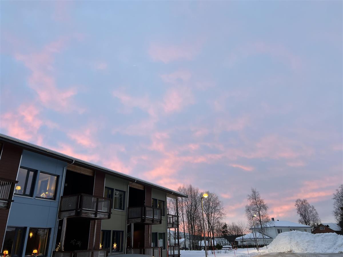 Lys i mørketid over omsorgsboligene ved Selfors.