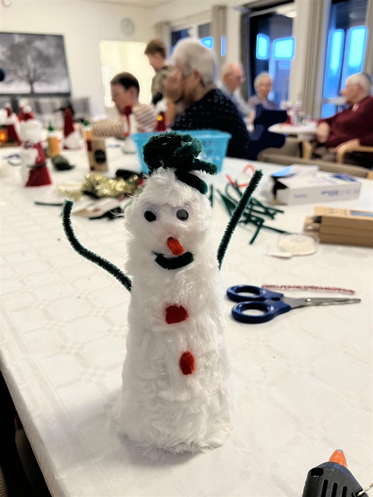Gjennom hele stunden så vi et nydelig samspill. Beboerne strålte over å få samarbeide, skravle og le sammen med «ungdommen». Flere fant virkelig tonen og lagde både nisser, snømenn og juletrær, mens andre ønsket å være i miljøet med en kopp kaffe og noe godt å bite i. Alt var helt lov, og nettopp det gjorde samværet så fint.