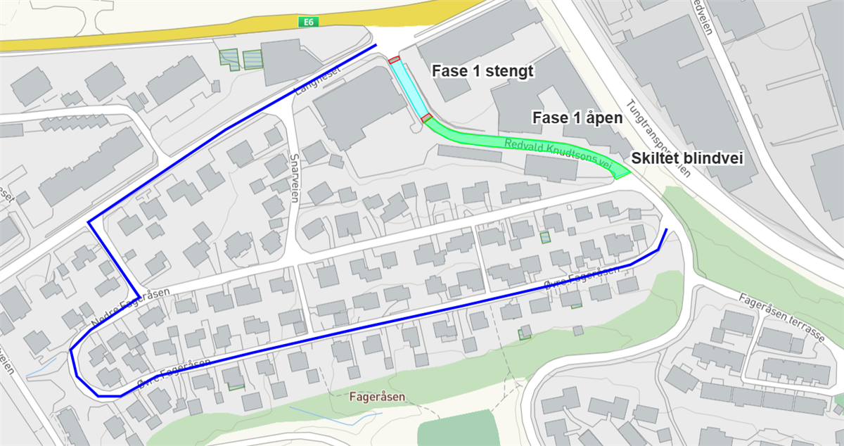 Skissen under viser stengning av Redvald Knudtssons vei fase 1, som planlegges utført i perioden uke 15-20. Omkjøring vil bli skiltet i henhold til godkjent skiltplan.