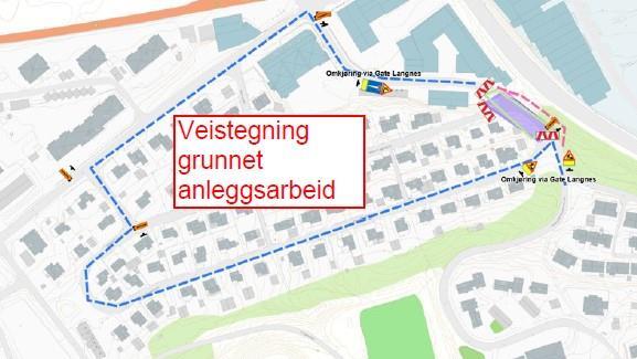 Omkjøring vil bli skiltet som vist i kartet.Vi beklager ulempene som anleggsarbeidene medfører.