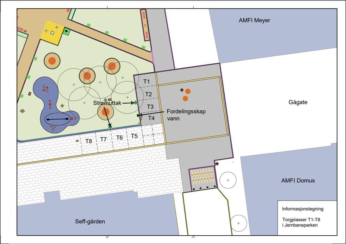 - Jernbaneparken: 8 plasser tilpasset salg av mat og ulike artikler. Her finnes tilgang til strøm og vann, og god plass til matvogner.